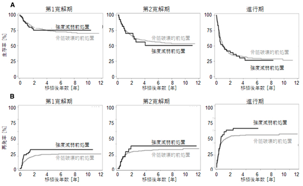 上段(A)は生存率、下段(B)は再発率を示しています。横3つは移植時期の違いを分けたものです。いずれも、 骨髄破壊的前処置(MAC)と強度減弱前処置(RIC)で、統計的な差はありませんでした。なお第1寛解期とは、化学療法で寛解(顕微鏡下できれいな状態)になりそのまま移植した場合です。第2寛解期は一度再発したのちに化学療法で寛解して移植した場合です。進行期とは、より治癒しにくい状態での移植で、化学療法で寛解していない場合、あるいは再発2回目以降の移植です。参考文献[3]を改変して表示しました。