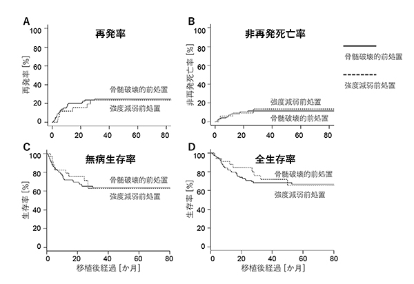 上段に再発率(A)と、再発とは無関係な死亡率(非再発死亡率;B)を示しています。下段は2種類の生存率です。骨髄破壊的前処置(MAC)と強度減弱前処置(RIC)で再発率、生存率ともに同等でした。なお無病生存率(C)とは再発なく生存できていること、全生存率(D)とは再発なしの生存と再発中の生存を合わせた割合をいいます。参考文献[2]を改変して表示しました。