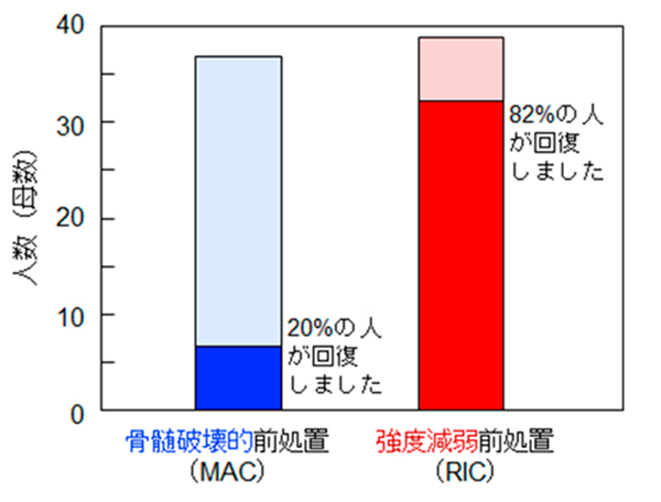 移植後に月経が回復した人の割合は、骨髄破壊的前処置(MAC;青色)では20%、強度減弱前処置(RIC;赤色)では8%でした。参考文献2. Figure 2Bを改変して表示しました。