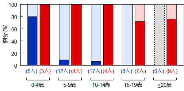 当センターでの実績として、女児ないしAYA世代(思春期・若年成人期)の女性に移植した場合、月経の発来ないし回復は、MACで移植した後で約20%(9〜27%)ですが、RIC後では約80%(79〜86%)となっています(図1)[1-3]。移植時期にも影響を受けます。MAC後に月経は、5歳未満での移植なら80%(4/5)に認められ、5歳以上での移植なら<10%(0〜8%)でした(図2)[3]。移植後に月経を認めた場合も、早発閉経のリスクが高いとされています。RIC後では、移植を15歳未満で受けた場合なら月経は 100%に、15歳以上でも75%に認められました。RIC後でも早発閉経となる可能性はあり、長期にフォローすることで詳細が分かってくると考えています。